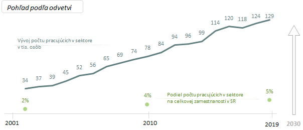 Úroveň počtu pracujúcich vo veľkej miere závisí aj od toho, ako sektor definujeme. Graf vyjadruje vývoj počtu pracujúcich pri definovaní sektora podľa prevažujúcej ekonomickej činnosti. V metodickej časti sú vymedzené odvetvia patriace do sektora. Sektor však môžeme definovať aj podľa typických sektorových zamestnaní. V takomto prípade je celkový počet pracujúcich v sektore na úrovni 309 tisíc osôb, čo je o 139 % viac ako pri odvetvovej agregácii a ich počet vzrástol od roku 2015 o 18 %.