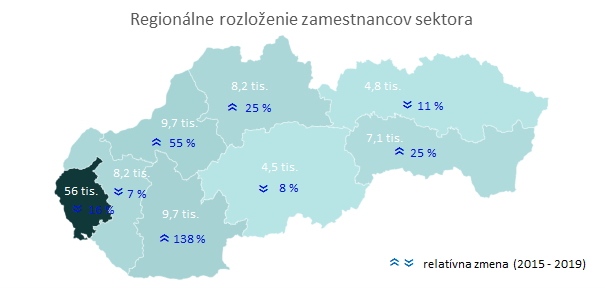 V sektore v súčasnosti pracuje o 278 % viac osôb ako pred 20 rokmi a podieľa sa 5 % na celkovej zamestnanosti v SR. Tento podiel od roku 2001 vzrástol o 4 p. b. Priemerný medziročný rast zamestnanosti v sektore je na úrovni 8 %. V porovnaní s nárastom v SR možno hovoriť o dynamicky rastúcom sektore z hľadiska počtu pracujúcich a patrí medzi 11 % sektorov s najvyšším rastom zamestnanosti. Najvyšší medziročný nárast počtu pracujúcich za posledných 20 rokov zaznamenal sektor v roku 2007, (o 17 %). Do roku 2030 sa očakáva nárast počtu pracovných síl. Najväčšími zamestnávateľmi v sektore sú IBM International Services Centre s.r.o., INDEX NOSLUŠ s.r.o. a Dell s.r.o., ktorí zamestnávajú 9 % zamestnancov sektora.