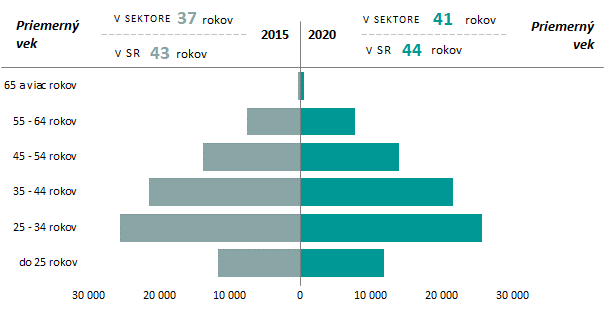 Sektor patrí medzi najmladšie sektory z hľadiska veku zamestnancov. Vyšší priemerný vek majú zamestnanci v 92 % sektorov. Priemerný vek zamestnancov v sektore je o 3 roky nižší ako v SR. V celej SR má 24 % zamestnancov 55 a viac rokov, v sektore je ich podiel na úrovni 17 %. Ak sektor definujeme podľa sektorových zamestnaní, priemerný vek zamestnancov je vyšší, na úrovni 44 rokov.