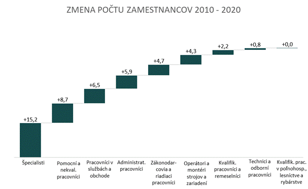 V sektore je nadpriemerný podiel pracovných miest s potrebou vysokej kvalifikácie. Z celkového počtu pracovných miest v sektore tvoria 30 % manažérske pozície a pozície pre špecialistov. Ich podiel za posledných 10 rokov vzrástol o 10 p. b. Najviac zamestnancov pracuje v hlavných triedach zamestnaní 2 Špecialisti a 3 Technici a odborní pracovníci, ktoré spolu majú 40 %-ný podiel na celkovej zamestnanosti sektora. Pri porovnaní s rokom 2010 sa najvýraznejšie zvýšil počet zamestnancov v hlavnej triede zamestnaní 2 Špecialisti, kde bol zaznamenaný nárast o 215 %. Najvýraznejší pokles v počte zamestnancov zaznamenáva hlavná trieda zamestnaní 6 Kvalifikovaní pracovníci v poľnohospodárstve, lesníctve a rybárstve, kde za posledných 10 rokov poklesol počet zamestnancov o 46 %.