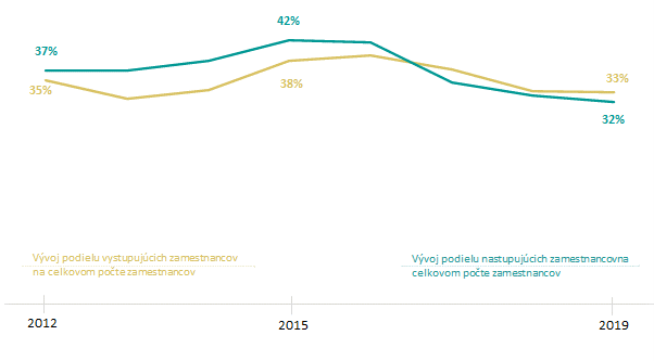 Vývoj podielu nastupujúcich a vystupujúcich zamestnancov na celkovom počte zamestnancov v sektore Administratíva, ekonomika, manažment medzi rokmi 2012 až 2019