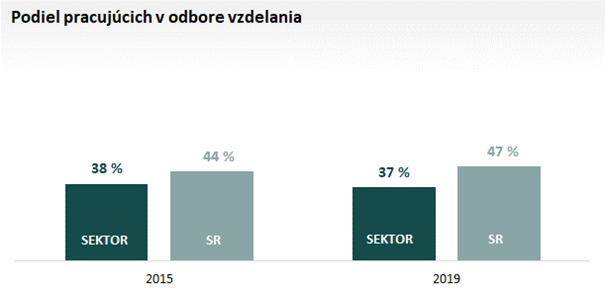 V sektore klesá podiel pracujúcich v odbore vzdelania. V súčasnosti približne 37 % zamestnancov sektora vyštudovalo optimálny odbor vzdelania k vykonávanému zamestnaniu. Pri vysokoškolských zamestnancoch v sektore je to 40 % a stredoškolských 33 %. Z hľadiska sektorovo špecifických zamestnaní vykonáva približne 38 % zamestnancov prácu, na ktorú sa aj pripravovali počas štúdia.