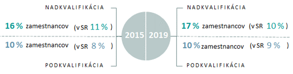 Porovnanie miery nadkvalifikácie a podkvalifikácie zamestnancov v celej ekonomike v rokoch 2015 a 2019
