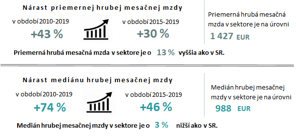 Za uplynulých 10 rokov vzrástli mzdy o 43 %, čo predstavuje 9 %-ný priemerný medziročný rast. Rast miezd v sektore tak vykazuje nižšiu dynamiku ako v podmienkach SR. V zahraničných spoločnostiach v sektore sú mzdy o 65 % vyššie ako v tuzemských.