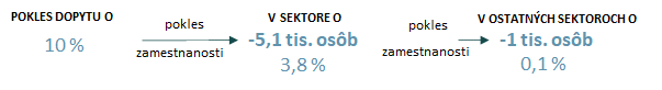 Dopad poklesu dopytu o 10 % na zamestnanosť v sektore Administratíva, ekonomika, manažment a v celej ekonomike v reálnych číslach a v percentách