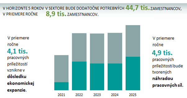 Vyššie uvedené hodnoty vyjadrujú potreby trhu práce z pohľadu sektorových zamestnaní. Ak sa však pozrieme na sektor z hľadiska spoločností a odvetví patriacich do sektora, celková dodatočná potreba pracovných síl v období 2021 – 2025 bude nižšia, na úrovni 16,4 tisíc osôb, z ktorých bude 39 % tvoriť náhrada pracovných síl.