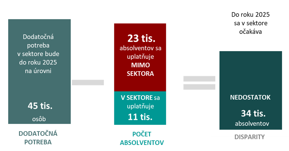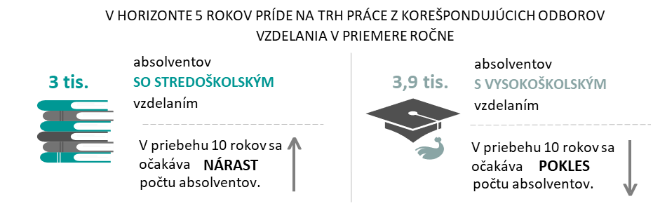 V období rokov 2021 – 2025 príde na trh práce 34,6 tisíc absolventov stredných a vysokých škôl, ktorí ukončia štúdium v niektorom z korešpondujúcich odborov vhodných pre výkon zamestnaní v tomto sektore a nebudú pokračovať v štúdiu. Približne 44 % z prichádzajúcich absolventov budú tvoriť absolventi stredných škôl, podiel absolventov vysokých škôl bude na úrovni 56 %. V dlhšom horizonte, v nasledujúcich 10 rokoch sa očakáva nárast počtu stredoškolských absolventov.