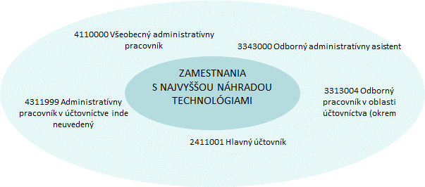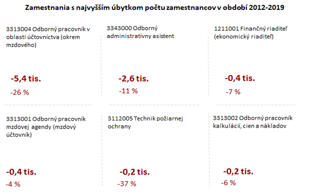 Najvýraznejší pokles počtu zamestnancov v sektore zaznamenáva 3313004 Odborný pracovník v oblasti účtovníctva (okrem mzdového). V danom zamestnaní poklesol počet zamestnancov za ostatných 7 rokov približne o 5,4 tisíc osôb, čo predstavuje pokles o 26 %. Najväčšie úbytky počtu zamestnancov sa v tomto sektore prejavili vo vysokokvalifikovaných zamestnaniach z hlavných tried zamestnaní 3 Technici a odborní pracovníci a 3 Technici a odborní pracovníci.