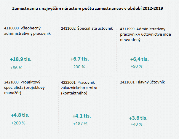 Najväčší nárast počtu zamestnancov v sektore Administratíva, ekonomika, manažment zaznamenávajú nízkokvalifikované zamestnania. V zamestnaní 4110000 Všeobecný administratívny pracovník bol zaznamenaný nárast o 86 %, resp. o 18,9 tisíc osôb za posledných 7 rokov.