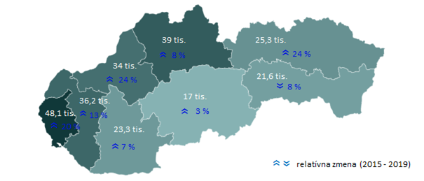 V Bratislavskom kraji pracuje až 20 % zamestnancov sektora, kde má sektor 8 %-ný podiel na celkovej zamestnanosti kraja. Spolu so Žilinským a Trnavským krajom tvoria spolu 50 % zamestnanosti sektora. Sektor automobilový priemysel a strojárstvo sa najrýchlejšie rozvíja v Trenčianskom kraji, kde za posledných 5 rokov vzrástol počet zamestnancov o 24 %. Najnižší počet zamestnancov sektora je v Banskobystrickom kraji. Regionálne rozloženie zamestnancov sektora je viditeľné na Obrázku č. 3.