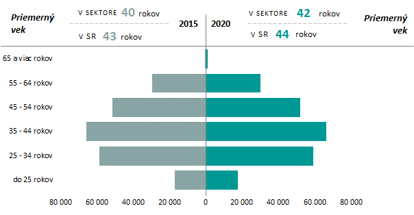 Sektor patrí medzi mladšie sektory z hľadiska veku zamestnancov. Vyšší priemerný vek majú zamestnanci v 88 % sektorov. Priemerný vek zamestnancov v sektore je o 2 roky nižší ako v SR. V celej SR má 24 % zamestnancov 55 a viac rokov, v sektore je ich podiel na úrovni 18 %. Ak sektor definujeme podľa sektorových zamestnaní, priemerný vek zamestnancov je vyšší, na úrovni 43 rokov (Graf č. 7). Divíziou s najnižším priemerným vekom (v roku 2020) je 29 Výroba motorových vozidiel, návesov a prívesov (priemerný vek bol 40 rokov), s najvyšším priemerným vekom divízia 33 Oprava a inštalácia strojov a prístrojov (priemerný vek bol 45 rokov).