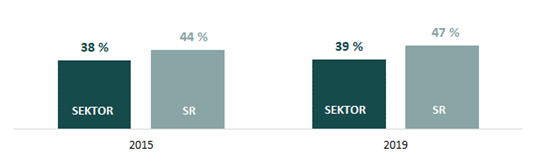 V sektore rastie podiel pracujúcich v odbore vzdelania. V súčasnosti približne 39 % zamestnancov sektora vyštudovalo optimálny odbor vzdelania k vykonávanému zamestnaniu. Pri stredoškolských a vysokoškolských zamestnancoch v sektore je to 39 % (Graf č. 8). Z hľadiska sektorovo špecifických zamestnaní vykonáva približne 45 % zamestnancov prácu, na ktorú sa aj pripravovali počas štúdia.