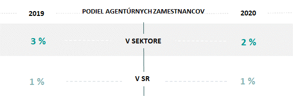 V sektore je vysoký podiel agentúrnych zamestnancov. Približne 1,5 % zamestnancov sektora je zamestnaných cez pracovnú agentúru a sektor zamestnáva 16 % všetkých agentúrnych zamestnancov v SR. Celkovo v SR pracuje cez agentúru 1 % zamestnancov. Obrázok č. 4 zobrazuje podiel agentúrnych zamestnancov.