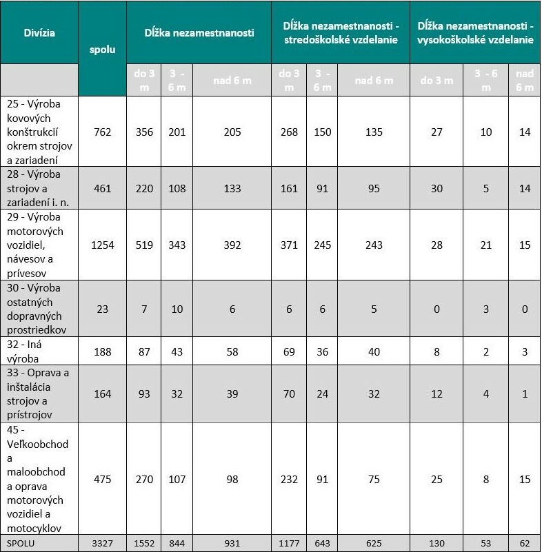 V máji 2021 bolo na trhu práce v SR 56 322 mladých nezamestnaných (do 29 rokov). V sektore automobilový priemysel a strojárstvo – definovanom divíziami 25, 28, 29, 30, 32, 33, 45 – bol počet nezamestnaných 3 327. Sektor sa tak podieľa na nezamestnanosti mladých 5,91 %-ami. Prehľad nezamestnaných podľa jednotlivých divízií, vrátane dĺžky nezamestnanosti, je uvedených v Tabuľke č. 1.