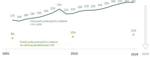 Úroveň počtu pracujúcich vo veľkej miere závisí aj od toho, ako sektor definujeme. Graf č. 11 vyjadruje vývoj počtu pracujúcich pri definovaní sektora podľa prevažujúcej ekonomickej činnosti. V metodickej časti sú vymedzené odvetvia patriace do sektora. Sektor však môžeme definovať aj podľa typických sektorových zamestnaní. V takomto prípade je celkový počet pracujúcich v sektore na úrovni 260 tisíc osôb, čo je o 8 % menej ako pri odvetvovej agregácii a ich počet vzrástol od roku 2015 o 26 %. Do roku 2030 očakávame pokles počtu pracujúcich v sektore.