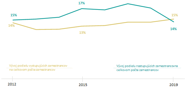 V roku 2019 v sektore automobilový priemysel a strojárstvo vystúpilo z pracovného pomeru 15 % zamestnancov, čo predstavuje približne 38 tisíc zamestnancov. V roku 2019 nastúpilo do pracovného pomeru 14 % zamestnancov, čo v absolútnych číslach predstavuje približne 36 tisíc zamestnancov (Graf č. 12). V období rokov 2012 – 2019 možno vidieť pomerne stabilnú fluktuáciu zamestnancov. Podiel vystupujúcich aj podiel nastupujúcich zamestnancov v sektore je nižší než na národnej úrovni. Sektor je tak charakteristický podpriemernou fluktuáciou pracovných síl.