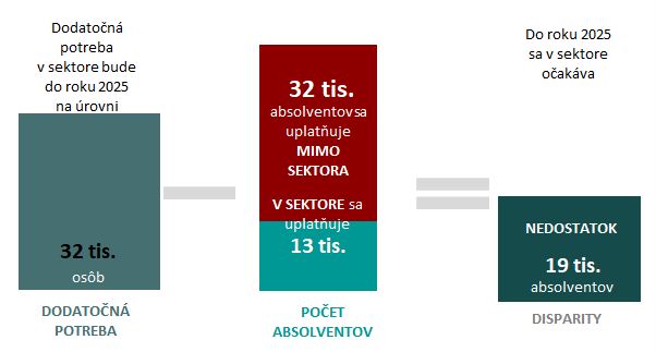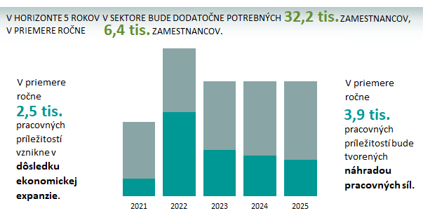 Celková dodatočná potreba ľudských zdrojov v sektore bude v období rokov 2021 – 2025 na úrovni približne 32,2 tisíc osôb, z ktorých 61% (3 900 pracovných príležitostí ročne) bude predstavovať náhradu pracovných síl a 39% (2 500 pracovných príležitostí ročne) pracovných príležitostí vznikne ako dôsledok ekonomickej expanzie.