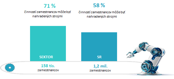 Približne 66 % zamestnancov v sektore vykonáva prácu, ktorú možno charakterizovať vysokým potenciálom automatizácie. V porovnaní s ostatnými sektormi a s celonárodným podielom (49 %), ide o pomerne vysoký podiel.