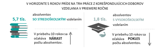 V období rokov 2021 – 2025 príde na trh práce 37,6 tisíc absolventov stredných a vysokých škôl (Schéma č. 6), ktorí ukončia štúdium v niektorom z korešpondujúcich odborov vhodných pre výkon zamestnaní v tomto sektore a nebudú pokračovať v štúdiu. Približne 76 % z prichádzajúcich absolventov budú tvoriť absolventi stredných škôl, podiel absolventov vysokých škôl bude na úrovni 24 %. V dlhšom horizonte – počas nasledujúcich 10 rokov – sa očakáva nárast počtu stredoškolských absolventov a pokles počtu vysokoškolských absolventov.