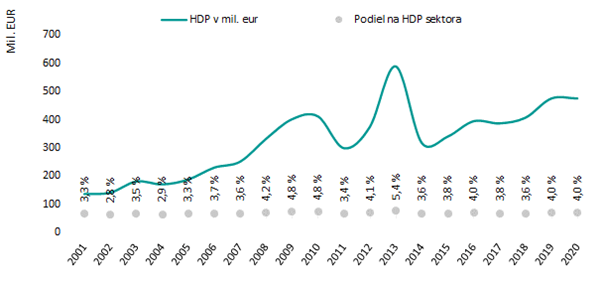 Vývoj HDP v divízii 77 Prenájom a lízing v mil. EUR a podiel divízie na celkovom HDP sektora bankovníctvo, finančné služby, poisťovníctvo v období 2001 – 2020