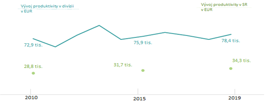 Mierne zlepšenie je vidieť v produktivite v rámci divízie Prenájom a lízing, keď od roku 2010 do roku 2019 napriek výkyvom došlo k nárastu produktivity z 72,9 tisíc EUR na 78,4 tisíc EUR, čo značí nárast o 7,5 %. Napriek tomu je potrebné poznamenať, že od úrovne z roku 2013 divízia v produktivite stagnuje, ale stále je vysoko nad priemernou produktivitou hospodárstva SR.