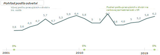 Za posledných 10 rokov vzniklo v tejto divízii 2 737 spoločností, čo predstavuje až 84 %-ný podiel na celkovom počte spoločností v divízii, z čoho za posledných 5 rokov to bolo 1 540 spoločností. Z hľadiska počtu zaniknutých spoločností za posledných 10 rokov zaniklo 1 177 spoločností (36 %-ný podiel na počte spoločností divízie). Z hľadiska tržieb došlo v divízii medzi rokmi 2014 až 2019 k nárastu tržieb o 48 % z 609,6 miliónov EUR na 904,2 miliónov EUR, čím priemerné tržby na jeden podnik stúpli zo 171,1 tisíc EUR na 230,5 tisíc EUR.