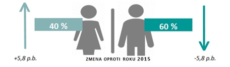 Na rozdiel od ostatných divízií sektora, divízii Prenájom a lízing dominujú prevažne zamestnanci z radov mužov, ktorí tvoria až 60 % pracujúcich, hoci oproti roku 2015 došlo k poklesu podielu mužských pracujúcich o 5,8 p. b.