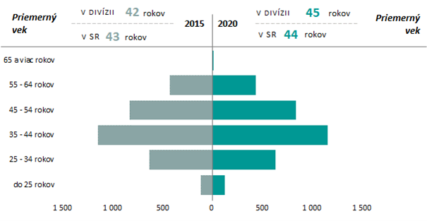 Priemerný vek pracujúcich v tejto divízii bol v roku 2020 na úrovni 45 rokov, čo je o 1 rok viac ako priemer ekonomiky SR. Oproti roku 2015 došlo k rastu priemerného veku o 3 roky. Najviac pracujúcich má táto divízia vo vekovej kategórii 35-44 rokov, nasledovaná kategóriou 45-54 rokov.