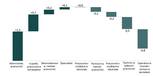 Z hľadiska vývoja a zmeny počtu zamestnancov v divízii došlo k rastu na pozíciách administratívnych pracovníkov, kde za 10 rokov došlo k rastu počtu zamestnancov o 1,2 %, kvalifikovaných pracovníkov a remeselníkov (0,7 %), riadiacich pracovníkov (0,2 %) a špecialistov (0,1 %). K poklesu došlo u operátorov a montérov strojov a zariadení s poklesom počtu zamestnancov o 0,8 %, technikov a odborných pracovníkov (0,5 %), pracovníkov v službách a obchode a pomocných a nekvalifikovaných pracovníkov (o 0,2 %).