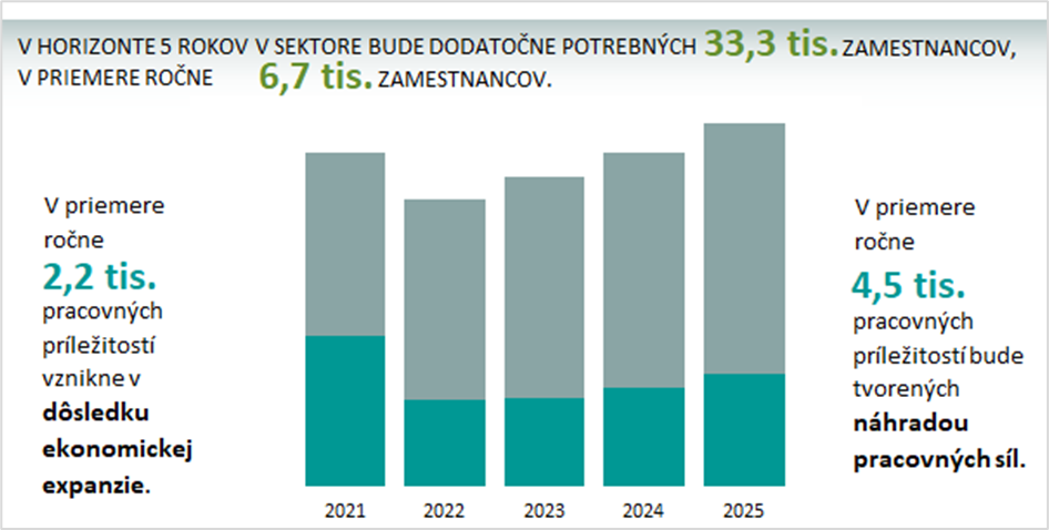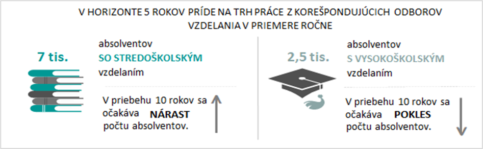 V období rokov 2021 – 2025 príde na trh práce 47,4 tisíc absolventov stredných a vysokých škôl, ktorí ukončia štúdium v niektorom z korešpondujúcich odborov vhodných pre výkon zamestnaní v tomto sektore a nebudú pokračovať v štúdiu. Približne 73 % z prichádzajúcich absolventov budú tvoriť absolventi stredných škôl, podiel absolventov vysokých škôl bude na úrovni 27 %. V dlhšom horizonte, v nasledujúcich 10 rokoch sa očakáva nárast počtu stredoškolských absolventov.