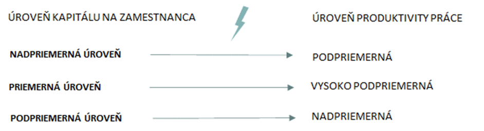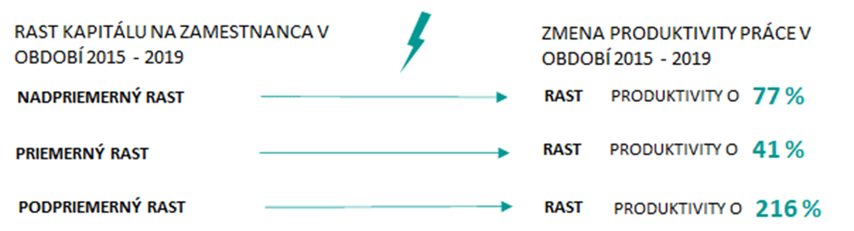 Podniky sektora energetika, plyn, elektrina, v ktorých na jedného zamestnanca pripadá nadpriemerný objem kapitálu, majú podpriemernú produktivitu práce. V podnikoch s nadpriemernými investíciami vzrástla produktivita práce o 77 %.