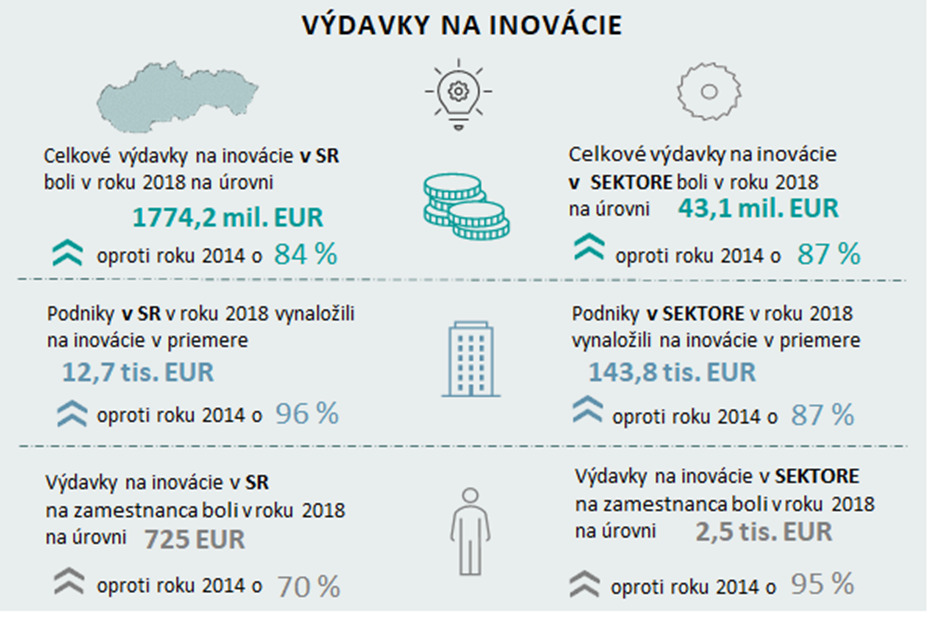 Sektor investuje do inovácií v priemere 143,8 tis. EUR na podnik, čo je 11-krát viac ako je národný priemer. Celkovo sa sektor podieľa 2 % -ami na celkových výdavkoch do inovácií v SR.