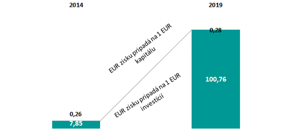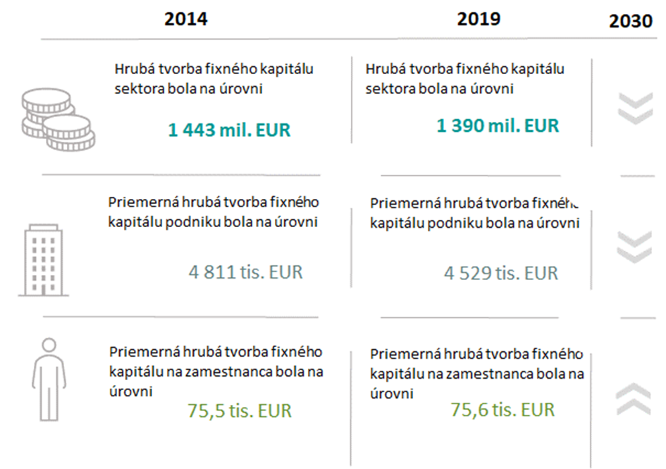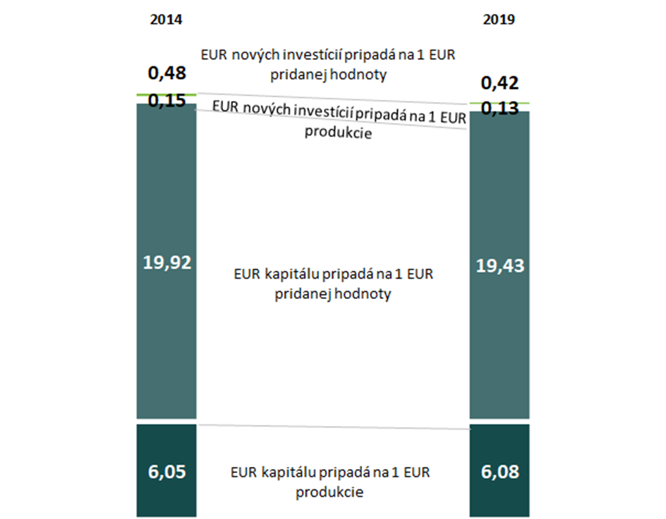 Podniky v sektore potrebujú v priemere kapitál na úrovni 6,08 EUR na tvorbu jedného eura produkcie a 19,43 EUR na tvorbu jedného eura pridanej hodnoty. Klesajúci trend tohto ukazovateľa hovorí o klesajúcom podiele kapitálu na výrobnom procese spoločností, ale súčasne hovorí aj o zvyšujúcej sa produktivite kapitálu (t. j. jednotka kapitálu v minulosti prinášala menší príspevok k tvorbe pridanej hodnoty ako v súčasnosti). Z každého eura realizovanej produkcie používajú spoločnosti na ďalšie investície približne 13 centov (13 %) a na každé euro pridanej hodnoty prislúcha približne 42 centov nových investícií.