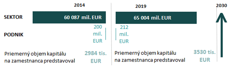 Podniky v sektore disponujú priemerným kapitálom na jedného zamestnanca na úrovni 3 530 tisíc EUR. Dlhodobý hmotný majetok z toho tvorí 97,2 %. Z hľadiska špecifických kapitálových položiek tvoria 36 % budovy a stavby, 53,6 % stroje a hnuteľné veci a 1,5 % softvérové vybavenie. Sektor má nadpriemernú potrebu kapitálu na zamestnanca (5-krát vyššiu ako priemer v SR) a patrí medzi 4 % sektorov s najvyššou kapitálovou náročnosťou produkcie. Keďže objem kapitálu na zamestnanca rastie, rastie aj jeho dôležitosť v produkčných procesoch. Tento rast je výraznejší ako v hospodárstve SR a je najvyšší spomedzi sektorov.