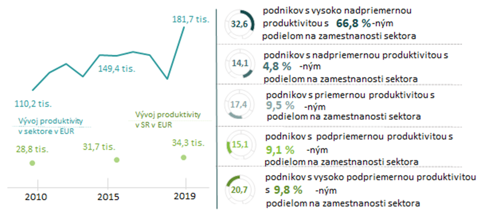 Sektor má v SR o 49 % nižšiu produktivitu práce ako v EÚ a patríme medzi 41 % krajín EÚ s najnižšou produktivitou práce v tomto sektore. Najvyššia produktivita práce sektora je v krajinách Španielsko, Portugalsko a Dánsko, kde je o 2-krát až 3-krát vyššia ako v SR.