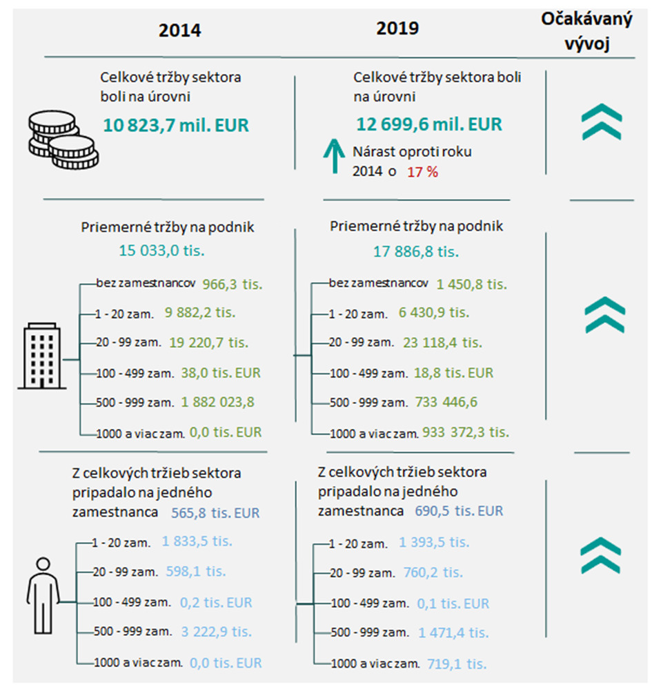 Podniky v sektore energetika, plyn, elektrina mali v roku 2019 celkové tržby vo výške 12 699,6 mil. EUR, podnikateľské subjekty (vrátane fyzických osôb – podnikateľov) mali v priemere 17 886,8 tis. EUR tržieb. V porovnaní s ostatnými sektormi, podniky v sektore majú pomerne vysoké tržby. Najvyššie tržby majú (v prepočte na podnik) podniky s 1 000 a viac zamestnancami, ktoré majú priemerné tržby na úrovni takmer 933 373 tis. EUR.