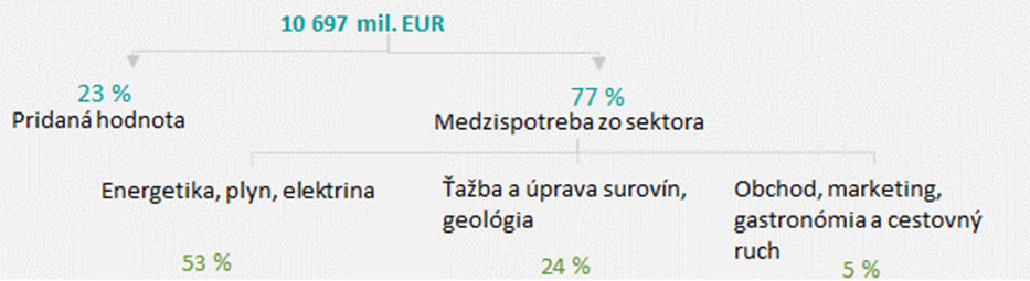 Pomer pridanej hodnoty a medzispotreby celkového objemu produkcie sektora energetika, plyn, elektrina je 23 % a 77 %. Hlavnými subdodávateľmi sektora sú sektory energetika, plyn, elektrina, ťažba a úprava surovín, geológia a obchod, marketing, gastronómia a cestovný ruch, ktoré spolu tvoria 82 % medzispotreby.