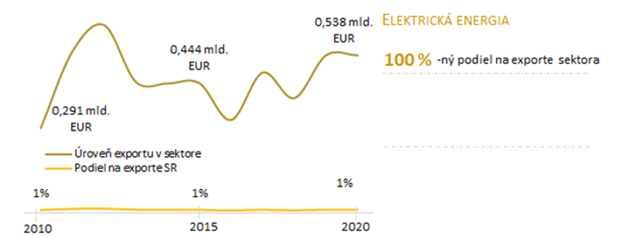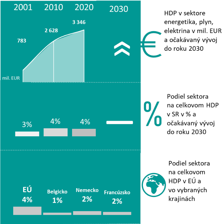 Sektor má v súčasnosti 4 %-ný podiel na tvorbe HDP v SR a tento podiel z dlhodobého pohľadu mierne rastie. Z hľadiska tvorby HDP tak patrí medzi top 46 % sektorov s najvyšším príspevkom k tvorbe HDP. Slovenská republika patrí medzi top 3 krajín EÚ s najvyšším podielom tohto sektora na celkovom HDP. Najvýznamnejšími spoločnosťami sú eustream, a. s. a Slovenské elektrárne, a. s., ktoré spolu tvoria 42 % celkového HDP v sektore. Top 10 spoločností tvorí približne 86 % HDP v sektore. Sektor má dominantné zastúpenie predovšetkým v Bratislavskom kraji, kde tvorí približne 8 % krajského HDP a v Košickom kraji s podielom daného sektora na úrovni 5 %. Tieto dva kraje tvoria spolu 83 % celkového HDP sektora v SR. Na základe dlhodobých vývojových tendencií očakávame výrazný rast pridanej hodnoty v sektore v najbližších 10 rokoch, avšak podiel na celkovom HDP v SR bude stagnovať.
