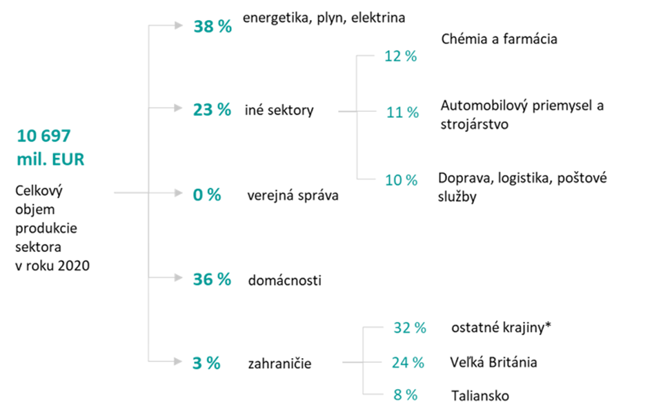 Najdominantnejšou kategóriou spotrebiteľov produkcie je sektor samotný s 38 % podielom na celkovej spotrebe produkcie sektora. Do zahraničia smeruje 3 % produkcie, z toho je 68 % vstupom do ďalšieho výrobného procesu v zahraničí. Sektor tak produkuje 37 % pre domácu finálnu spotrebu, 1 % pre finálnu spotrebu v zahraničí, 61 % pre domácu medzispotrebu a 2 % pre medzispotrebu v zahraničí. Hlavnými spotrebiteľmi produkcie v zahraničí sú Veľká Británia, Taliansko a ostatné krajiny[1].
