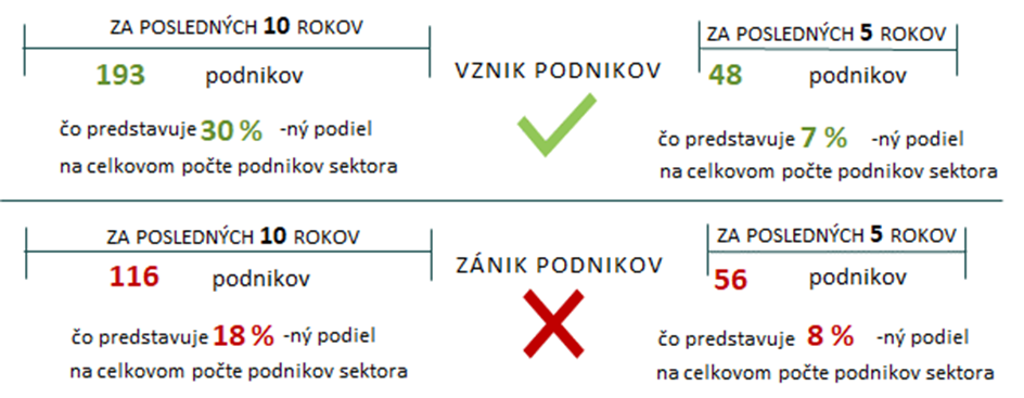 Za posledných 5 rokov pripadalo na 100 existujúcich podnikateľských subjektov 7 novovzniknutých a 8 zaniknutých podnikateľských subjektov. V dlhodobom horizonte dynamika vzniku podnikateľských subjektov klesá a klesá aj počet zaniknutých podnikov. V porovnaní so SR sa sektor vyznačuje nižšou dynamikou vzniku a zániku podnikateľských subjektov. Prevažnú časť vzniknutých aj zaniknutých podnikateľských subjektov predstavujú spoločnosti s ručením obmedzeným (57 %).
