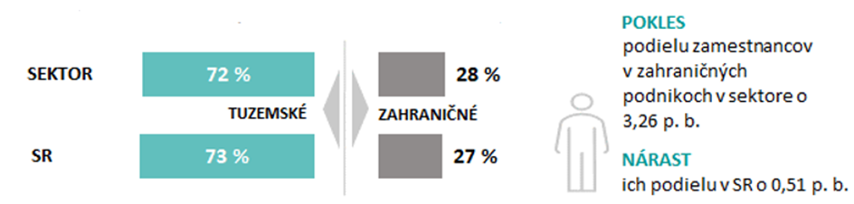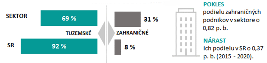V sektore dominujú tuzemské podniky s 69 %-ným zastúpením a 72 %-ným podielom na zamestnanosti sektora. V sektore tak pracuje väčšia časť zamestnancov v zahraničných podnikoch ako v slovenských podnikoch. V porovnaní s rokom 2015, podiel zahraničných podnikov v sektore poklesol o 0,8 p. b. a záujem zahraničných investorov klesá.