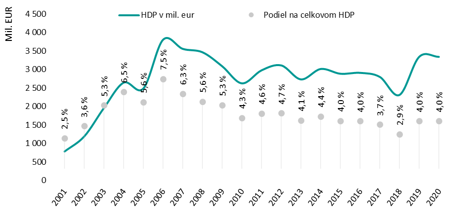Vývoj HDP v sektore energetika, plyn a elektrina v mil. EUR a podiel sektora na celkovom HDP v období 2001 – 2020