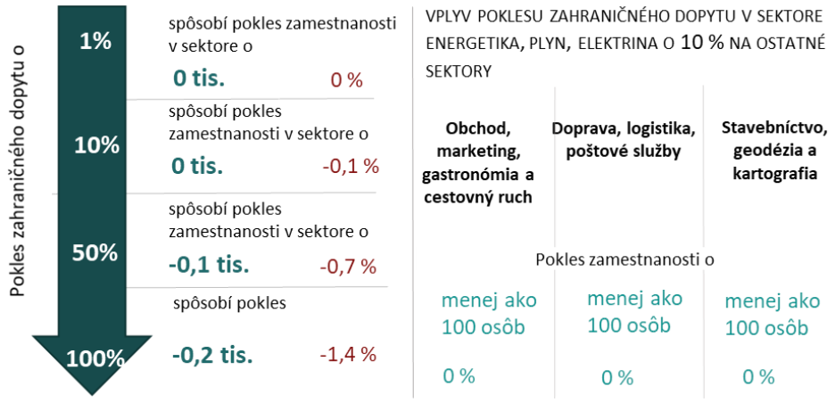 Obrázok vyjadruje pokles zamestnanosti v súvislosti s poklesom finálneho dopytu v zahraničí. To znamená pokles súvisiaci s poklesom dopytu po finálnych tovaroch a službách. Zahraničie však dopytuje produkty sektora aj na medzispotrebu, teda ako vstupy do ďalšej výroby. Ak aj táto klesne o 10 %, tak to bude znamenať pokles zamestnanosti o ďalších menej ako tisíc zamestnancov v sektore (o ďalšie 0,1 %). V hypotetickom scenári, ak by poklesol zahraničný dopyt po produkcii sektora úplne na nulu, tak by to znamenalo pokles zamestnanosti takmer o 0,5 tisíc osôb (0,2 tisíc v dôsledku poklesu finálneho dopytu a 0,2 tisíc v dôsledku poklesu dopytu po tovaroch a službách, ktoré sú vstupom pre ďalšiu výrobu). Vo všeobecnosti patrí energetika, plyn, elektrina medzi sektory s najmenším vplyvom zahraničia na zamestnanosť.