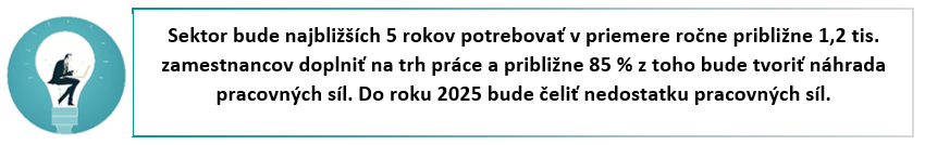 V priebehu najbližších piatich rokov bude v sektore dodatočne potrebných takmer 6 tisíc zamestnancov. Mzdy v sektore sú síce nad úrovňou SR (zamestnanci v priemere zarábajú 1 873 Eur mesačne), napriek tomu 7 % absolventov prichádzajúcich na trh práce z korešpondujúcich odborov vzdelania odchádza pracovať za hranice SR. Z korešpondujúcich odborov vzdelania sa v období 2021 – 2025 uplatní v sektore približne 2 tisíc zamestnancov a sektor tak bude čeliť nedostatku pracovných síl. Medzi zamestnania s najvyššími potrebami na trhu práce do roku 2025 patrí Mechanik, opravár strojov a zariadení v energetike, Operátor parného stroja a kotla, Prevádzkový zámočník a Technik podpory inžinieringu v energetike. V najbližších 20-tich rokoch sa očakáva, že v sektore bude možné technológiami nahradiť približne 48 % pracovných činností.