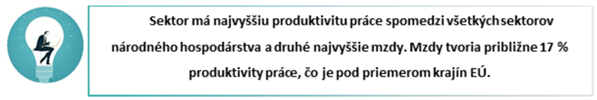 Vysoká produktivita práce samozrejme do veľkej miery vplýva aj na výšku mzdy. V sektore sú druhé najvyššie mzdy po ITK – na úrovni 1 873 EUR, čo je o takmer 50 % viac ako priemer v SR. V období 2010 – 2019 vzrástli mzdy v sektore vzrástli o približne 45 %.