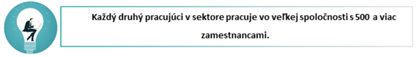 Veľké podniky v sektore energetika, elektrina a plyn majú dominantné postavenie nielen z hľadiska tvorby HDP, ale aj z hľadiska zamestnanosti. Podniky s 500 – 999 zamestnancami zamestnávajú 2 tisíc pracujúcich a vo veľkých podnikoch s 1 000 a viac zamestnancami pracuje 8 tisíc osôb. Tieto dve veľkostné kategórie sa tak podieľajú na zamestnanosti sektora 50 %-mi. Najväčšími zamestnávateľmi v sektore sú Slovenské elektrárne, a. s., Západoslovenská distribučná, a. s. a Stredoslovenská distribučná, a. s. – zamestnávajú 36 % zamestnancov sektora. V súčasnosti pracuje v sektore 18,5 tisíc zamestnancov, čo je o 46 % menej ako pred 20 rokmi. Sektor sa podieľa na celkovej zamestnanosti v SR podieľa 0,8 % a je teda tretím najmenším sektorom z hľadiska počtu zamestnancov (nižšiu úroveň má len Ťažba a Celulózo-papierenský a polygrafický priemysel). V EÚ pracuje v sektore v priemere 0,5 % zamestnancov a nízky podiel sektora na zamestnanosti tak nie je špecifický len pre SR. Najviac poklesol počet zamestnancov v hlavných triedach zamestnaní 8 Operátori a montéri strojov a zariadení a 3 Technici a odborní pracovníci. Zároveň vzrástol počet špecialistov a administratívnych pracovníkov. Z regionálneho hľadiska má dominantné postavenie Bratislavský kraj, ktorý zamestnáva viac ako tretinu zamestnancov sektora, pričom 68 % z nich dochádza za prácou z iného kraja. Tento prevažne „mužský“ sektor (3/4 zamestnancov tvoria muži) sa vyznačuje nadpriemerným podielom vysokoškolsky vzdelaných zamestnancov (54 %).