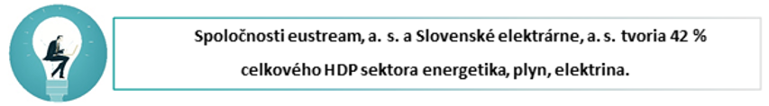 Sektor má v súčasnosti 4 %-ný podiel na tvorbe HDP v SR a tento podiel z dlhodobého pohľadu mierne rastie. Najvýznamnejšími spoločnosťami sektora sú eustream, a. s. a Slovenské elektrárne, a. s., ktoré majú spolu 42 %-ný príspevok k tvorbe HDP sektora a zamestnávajú celkovo takmer 4 000 zamestnancov. Veľké spoločnosti s viac ako 1 000 zamestnancami majú v sektore dominantné postavenie – majú 51 %-ný príspevok k tvorbe HDP. Väčšina významných spoločností sektora sídli v Bratislavskom a Košickom kraji, tieto dva kraje tvoria spolu 83 % celkového HDP sektora. V medzinárodnom meradle sa SR nachádza medzi top 3 krajinami EÚ s najvyšším podielom tohto sektora na HDP. Vysoké postavenie má sektor v Bulharsku, ktoré je významným výrobcom elektriny a v Estónsku, ktoré je takmer energeticky nezávislé.