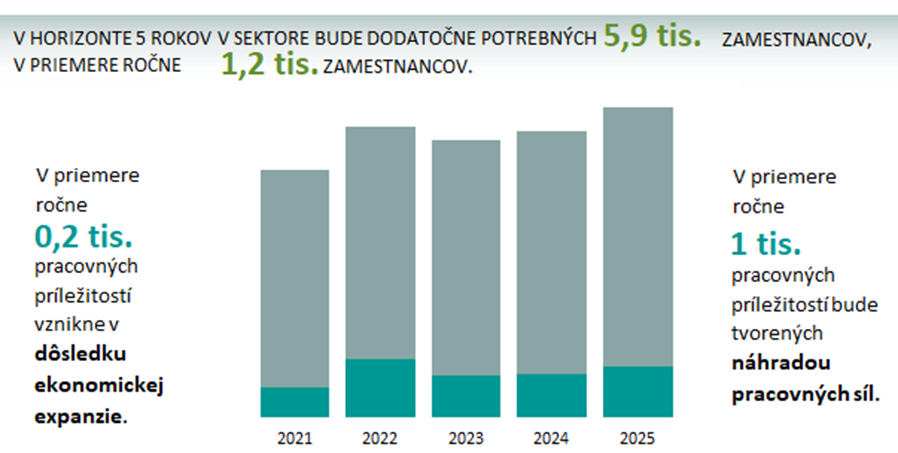 Vyššie uvedené hodnoty vyjadrujú potreby trhu práce z pohľadu sektorových zamestnaní. Ak sa však pozrieme na sektor z hľadiska spoločností a odvetví patriacich do sektora, celková dodatočná potreba pracovných síl v období 2021 – 2025 bude nižšia, na úrovni 2,7 tisíc osôb, z ktorých bude 90 % tvoriť náhrada pracovných síl.