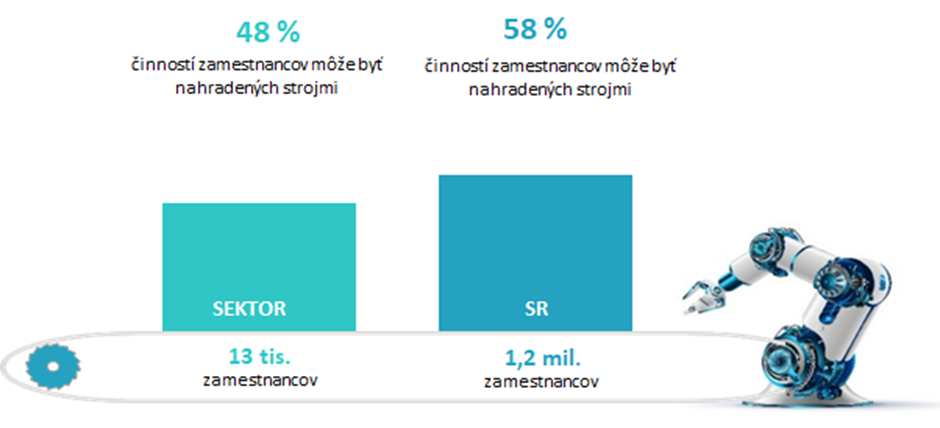 Približne 36 % zamestnancov v sektore vykonáva prácu, ktorú možno charakterizovať vysokým potenciálom automatizácie. V porovnaní s ostatnými sektormi a s celonárodným podielom (49 %), ide o pomerne nízky podiel.