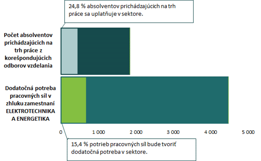 Najviac, približne 700 osôb v sektore energetika, plyn, elektrina bude potrebných v zhluku zamestnaní ELEKTROTECHNIKA A ENERGETIKA. Popritom príde do roku 2025 na trh práce približne 1,8 tisíc absolventov, ktorí ukončia štúdium v niektorom z korešpondujúcich odborov vzdelania vhodných pre výkon zamestnaní patriacich do tohto zhluku zamestnaní. Z absolventov prichádzajúcich na trh práce sa v sektore uplatňuje približne 25 % – v sektore sa tak do roku 2025 v tomto zhluku očakáva nedostatok pracovných síl.